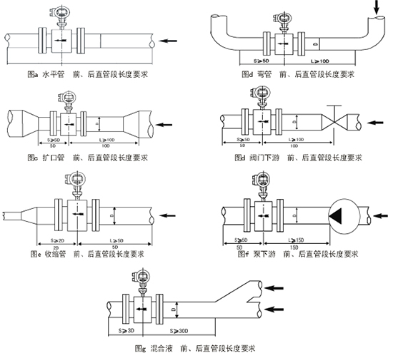 插入式進(jìn)口直管段應(yīng)≥ 20 D , 出口直管段≥7D(D為傳感器公稱口徑)。