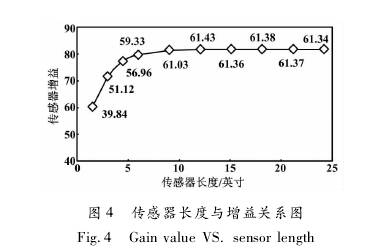 采用一臺日徑為6英寸、標準線圈的傳感器,改變傳感器長度,依次進行試驗室標定試驗。傳感器長度與增益的關系圖如圖4所示。當傳感器長度為9. 1英寸時,其增益為61. 03;但當其長度繼續增加時,增益變化較小;當其長度6. 1英寸減小到0時,增益從59. 33開始下降。也就是說,當傳感器長度為6. 1-9. 1英寸時,既有效利用了線圈產生的磁場,又可使傳感器長度較短。