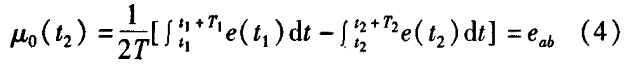 冷熱水流量計(jì)一般都采用工頻交流電源供電,其電源電壓的幅值和頻率的變化都會(huì)給冷熱水流量計(jì)帶來(lái)電源性干擾噪聲。對(duì)電源電壓的幅值變化,因采用多級(jí)集成穩(wěn)壓,一般而言電源電壓的幅值變化對(duì)電磁流量的測(cè)量精度影響不大。當(dāng)電源電壓的頻率波動(dòng)時(shí),雖然其波動(dòng)范圍有限,但對(duì)冷熱水流量計(jì)測(cè)量精度影響較大。為了解決工頻干擾問(wèn)題,實(shí)現(xiàn)對(duì)流體流速感應(yīng)電勢(shì)e柚信號(hào)的準(zhǔn)確測(cè)量,需利用以下基本關(guān)系:①勵(lì)磁周期為工頻周期的整數(shù)倍,即勵(lì)磁頻率為50/nHz(n為偶數(shù));②正負(fù)勵(lì)磁下的同相位采樣。圖2是對(duì)應(yīng)低頻矩形波勵(lì)磁形式下的典型電勢(shì)信號(hào)形式,按上述關(guān)系在一個(gè)勵(lì)磁周期下,若假設(shè)t。和t:點(diǎn)為工頻干擾的等效干擾點(diǎn),且采樣寬度T=T1=T2,則e –ab的基本算式為:,