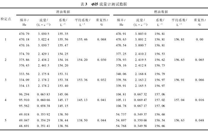 依據表3測試數據,經計算可得,Φ25流量計在滑油及燃油中測試結果如表4所示,測試線形圖如圖3所示。