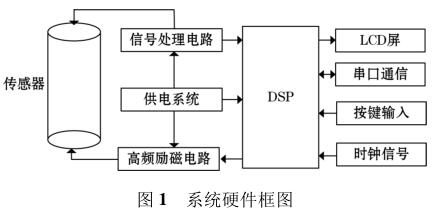 高頻勵(lì)磁煤焦油流量計(jì)由傳感器、高頻勵(lì)磁電路、信號處理電路等組成,其中高頻勵(lì)磁電路決定著傳感器磁場的強(qiáng)弱,勵(lì)磁電路的穩(wěn)定性以及精確性決定著系統(tǒng)檢測的準(zhǔn)確性以及穩(wěn)定性。DSP 系統(tǒng)控制勵(lì)磁電路激勵(lì)傳感器線圈,當(dāng)線圈中有導(dǎo)電液體流過時(shí),其切割磁感線并在傳感器兩端的線圈上產(chǎn)生感應(yīng)電動(dòng)勢,利用信號檢測電路監(jiān)測感應(yīng)電動(dòng)勢的大小,*后根據(jù)相應(yīng)關(guān)系計(jì)算出液體的流量,系統(tǒng)硬件框圖如圖 1 所示。