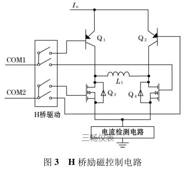 如圖2 所示,在對傳感器線圈進(jìn)行勵(lì)磁時(shí),通過比較器控制切換開關(guān)切換高低壓進(jìn)行勵(lì)磁。V ref 作為比較器的基準(zhǔn)輸入端,其表示勵(lì)磁電流的電壓穩(wěn)態(tài)值;而 C ur 則表示 H 橋勵(lì)磁電路中檢測到的電壓信號。一開始當(dāng)系統(tǒng)處于低壓勵(lì)磁狀態(tài)時(shí),系統(tǒng)會(huì)自動(dòng)斷開切換電路中的電流旁路,此時(shí)系統(tǒng)通過利用 H 橋向勵(lì)磁線圈提供恒定電流。當(dāng)勵(lì)磁方向變化時(shí),電流檢測電路就會(huì)檢測到電流變?yōu)樨?fù)方向,比較器的 C ur 端與V ref 端的平衡就會(huì)發(fā)生變化,此時(shí)系統(tǒng)通過比較器自動(dòng)切換為高壓勵(lì)磁狀態(tài)。與低壓勵(lì)磁方式相反,在此種狀態(tài)下,恒流控制電路關(guān)閉而電流旁路打開,線圈中的能量就會(huì)存儲在能量回饋電路中,此時(shí) C 1 端的電壓會(huì)超過高壓源。等勵(lì)磁線圈中的能量釋放完后,電流逐漸降為零,此時(shí)能量回饋電路就會(huì)利用電流旁路和 H 橋?qū)⒛芰糠答伣o勵(lì)磁線圈。當(dāng)電容 C 1 端的電壓下降到小于高壓源時(shí),系統(tǒng)就會(huì)自動(dòng)通過電流旁路和H 橋直接對勵(lì)磁線圈進(jìn)行勵(lì)磁,當(dāng)勵(lì)磁線圈中的電流超過設(shè)定閾值時(shí),C ur 端電壓就會(huì)大于 V ref 點(diǎn)電壓,此時(shí)比較器又會(huì)切換成低壓勵(lì)磁方式,如此反復(fù)循環(huán)控制,達(dá)到對勵(lì)磁線圈恒流控制的目的。圖 3 為 H 橋勵(lì)磁控制電路。