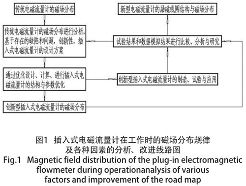 dn80泥漿流量計因其特殊的結構形式,致使其抗干擾能力較弱、準確度偏低以及瞬時流量波動過大等不良現象,但便于安裝、造價低廉、普遍應用于大管道等特點而存在。為了發揮其優勢,消除其不利因素,對其內部結構及其相關技術參數進行優化設計,從而使其準確度能夠達到 ±1% FS,使抗干擾能力得到極大地增強。本文主要通過優化設計、選擇材料和試驗,使dn80泥漿流量計的穩定性和準確度大幅度提高,并提出解決措施,對實際應用具有參考價值。分析與研究程序圖如圖 1 所示。