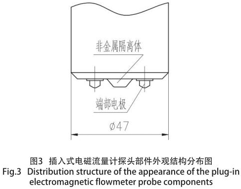 通過大量的試驗,對探頭端部外型結構亦采用特殊設計,從而消除兩個電極之間的擾流現象,同時亦消除因通電產生磁場,導致兩個電極吸附介質中的鐵屑而影響測量精度和死區效應,增強了輸出信號的穩定性,從而提高傳感器準確度和抗干擾性。通過結構的優化設計,使用壽命更長,dn80泥漿流量計探頭局部,如圖 3 所示。