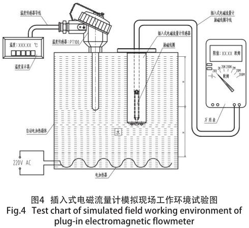 試驗方法:*先,把dn80泥漿流量計和溫度傳感器按照圖中所示固定在自動加熱箱體中;其次,把dn80泥漿流量計的勵磁線圈的引線(聚四氟乙烯屏蔽線)與萬用表測量阻值端鈕相連接,并把檔位定格在 200Ω 刻度線上;同時把溫度傳感器(PT100 鉑電阻)的引線與溫度顯示器相連接。