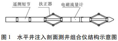 水平井注入剖面測井組合儀是針對水平井籠統注水井注入剖面測井專門研制的,儀器結構如圖 1 所示。井下儀器主要包括通用短節( 遙測、溫度、壓力和 CCL) 、硫酸銅流量計和滾輪式扶正器。測量參數包括流量、溫 度、壓力、自然伽馬和深度。流量計采用的是非集流硫酸銅流量計和集流型硫酸銅流量計,對于注入量較大的井采用非集流硫酸銅流量計,注入量較小的井采用集流型硫酸銅流量計,測量方式采用定點測量。儀器采用遙測技術實現了多參數同時測量和傳輸,儀器外徑 38 mm,耐壓80 MPa,耐溫150 ℃,流量測量范圍為1 ~ 800 m3 /d,測量精度 ± 5% 。