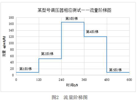 該測試主要利用實驗室測試條件,模擬客戶現場使用情況。其主要測試內容包括:測試高溫液體流量計在+23℃,-30℃和-40℃三種溫度下,高溫液體流量計出口壓力分別在2.1kPa和30kPa時,流量分別從*1階梯到*5階梯時的響應速度,客戶所提供的流量階梯如圖2所示。橫軸表示下游球閥開啟動作時間,縱軸表示高溫液體流量計下游需要的流量q。