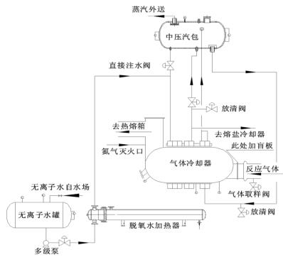 來自無離子水罐的脫氧水經多經泵加壓、經脫氧水加熱器加熱后進入到液體渦街流量計的水段,脫氧水與反應氣體換熱后分兩路:一路進入中壓汽包,保證汽包有穩定的液位;一路進入熔鹽冷卻器帶出熔鹽攜帶的反應熱。來自中壓汽包的高溫水經管路接至液體渦街流量計汽段底部,高溫水與反應氣體換熱后產生高壓蒸汽,高壓蒸汽又返回中壓汽包。汽包還有一路直接注水管路,此路水不經過液體渦街流量計水段,而是直接進入汽包。在液體渦街流量計出口溫度偏低而汽包液位也比較低時,可開此直接注水管路來穩定汽包液位。其詳細流程圖如圖 2。