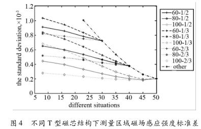 如圖3所示為不同T型磁芯結構下測量區域產生磁場感應強度平均值,圖中橫坐標為T型磁芯b的角度,縱坐標為測量區域的平均磁場強度,圖標表示的是T型磁芯的不同a的角度以及磁芯長端寬度所占的比例。其中以“角度-比例”表示,例如30-1/2表示T型磁芯的較長端角度a為30°,k1/(k1+k2)為1/2時的測量區域中平均磁場強度測量結果。圖標Other為T型磁芯較長端的角度a與較短端的角度b相等(即為23,30,35,40,45,50)時的流量計測量區域中的平均磁場強度。從仿真結果可以看出:T型磁芯的較長端的角度a越小,流量計測量區域中平均磁場強度越大;在T型磁芯的較長端的角度a一定時,T型磁芯的較短端的角度b越小,流量計測量區域中平均磁場強度越大;在T型磁芯的較長端的角度a與較短端的角度b一定時,T型磁芯的k1/(k1 + k2)越小,在流量計測量區域中平均磁場強度越大。